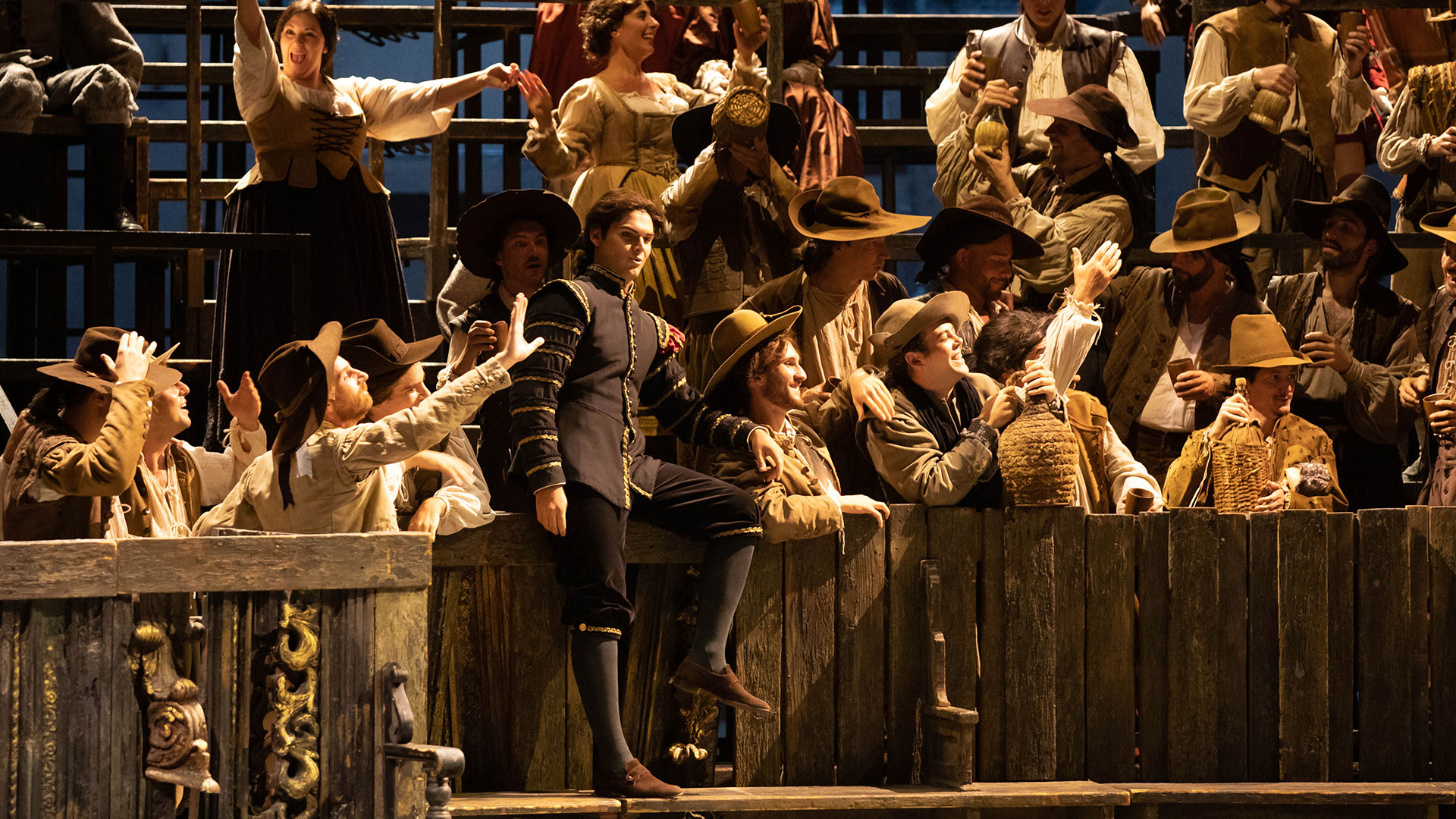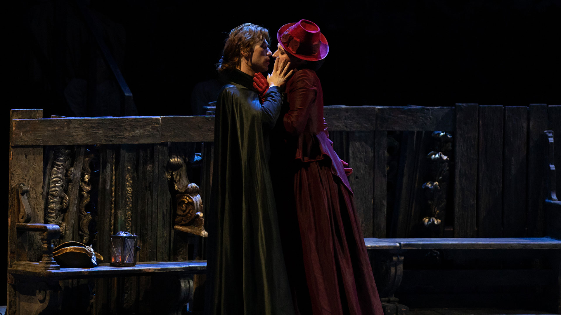 Disguises, dark places and lost doors meander along the score. The narrative device of this work is a labyrinth, strangely more like a screenplay than a theatrical plot.